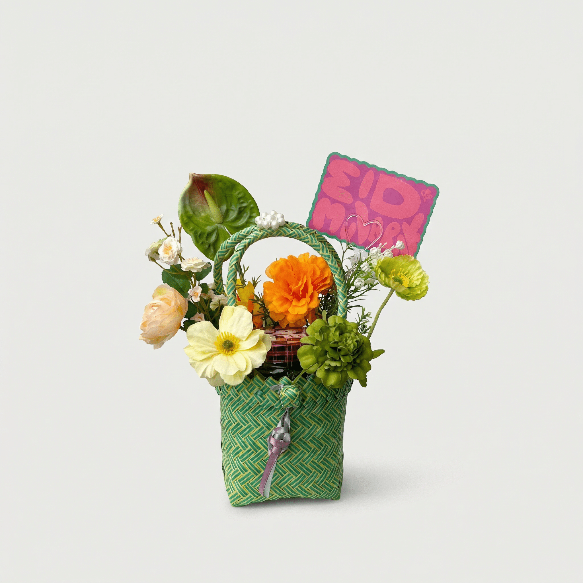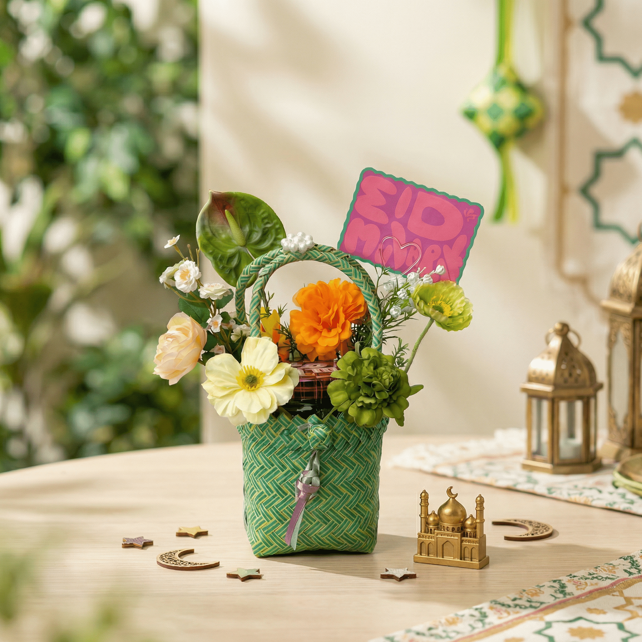 A festive Eid flower arrangement in a ketupat-inspired bag with artificial flowers and Eid greeting card.