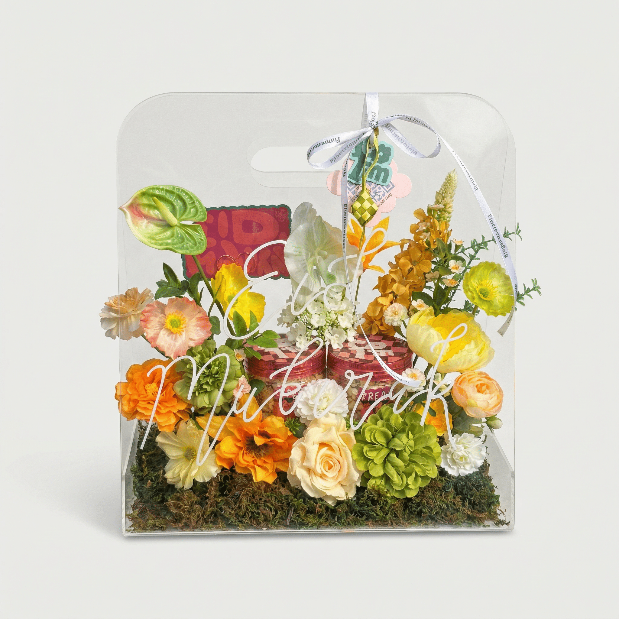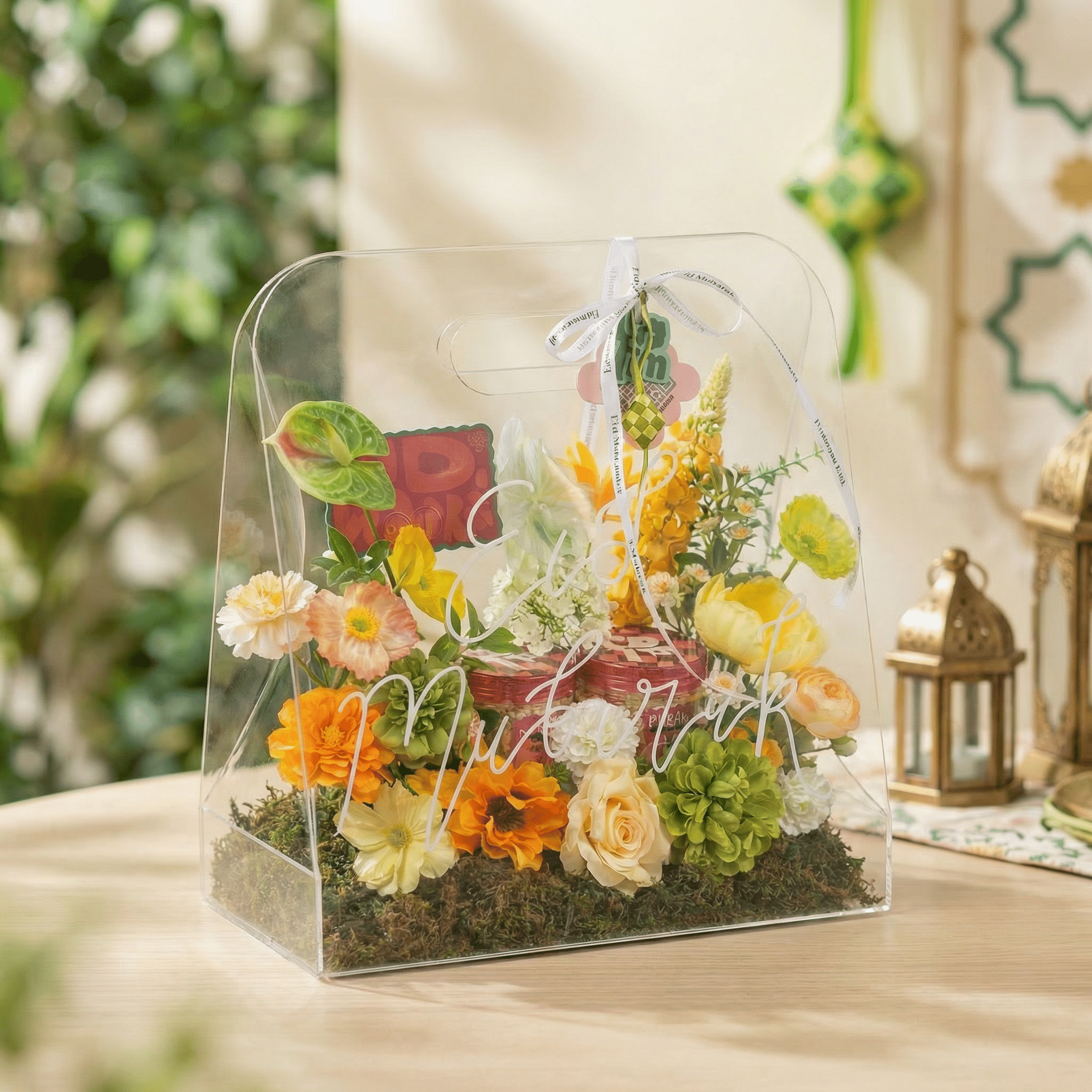 Inside the arrangement are two jars of Eid Treats, making FM Eid Glass not just a decorative piece but also a sweet gift to enjoy. The transparent case keeps everything beautifully visible while protecting the arrangement, making it perfect as a statement Eid hamper.
